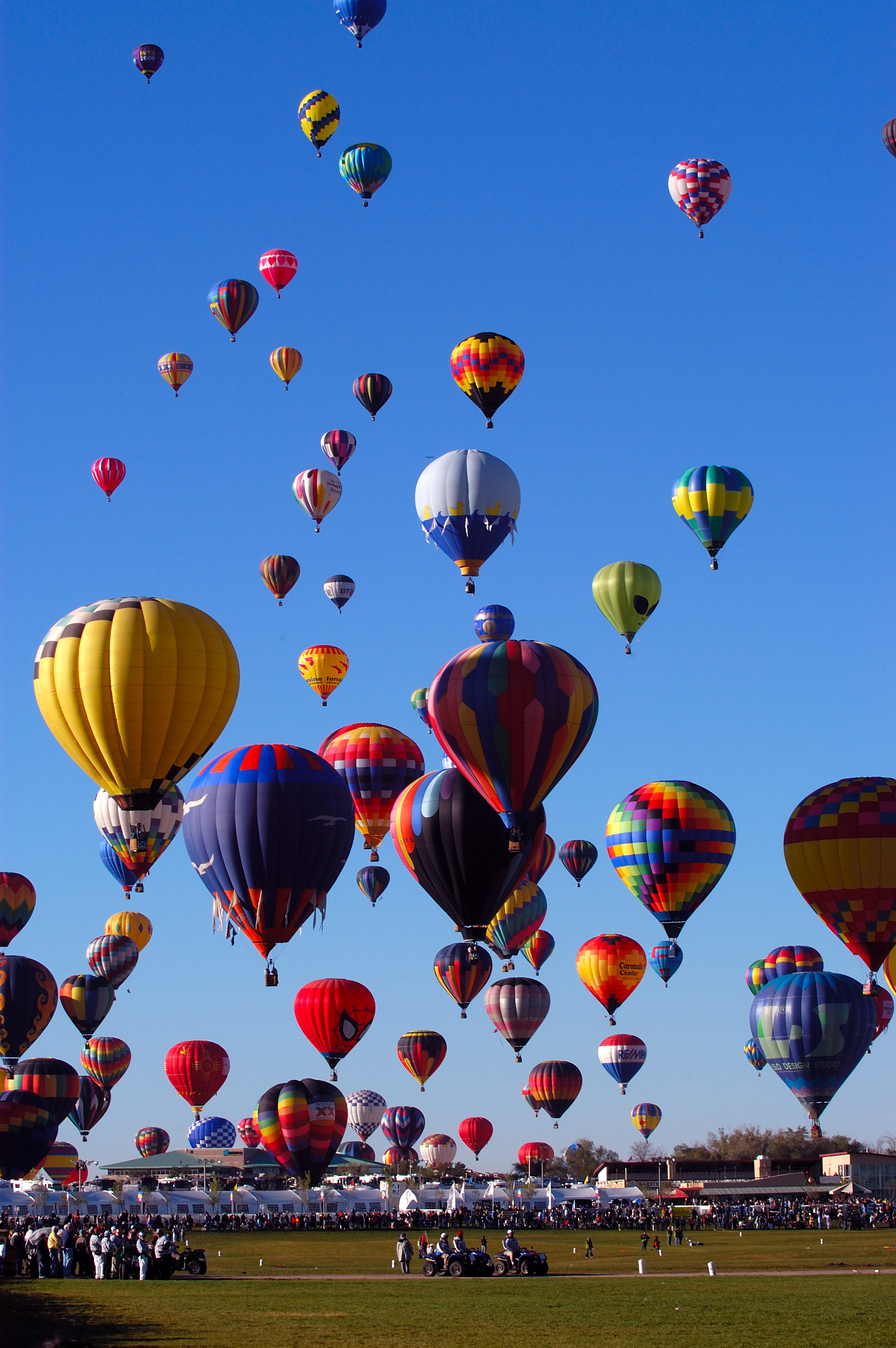 The Mass Ascension, a launch of all participating balloons, has been part of the Fiesta since the beginning. Balloons launch at 7 a.m. in two waves, with launch directors dressed in black and white stripes making sure everyone gets up safely. The clear desert sky provides a canvas for the multi-colored balloons. The sight of 600 balloons all taking off at the same time is as exciting to Fiesta veterans as it is to first-timers.
